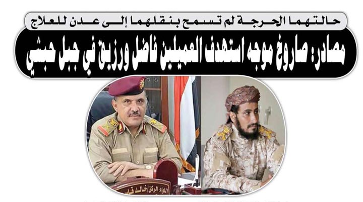 حالتهما الحرجة لم تسمح بنقلهما إلى عدن للعلاج.. مصادر: صاروخ موجه استهدف العميلين فاضل ورزيق في جبل حبشي
