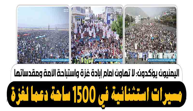 اليمنيون يؤكدون: لا تهاون أمام إبادة غزة واستباحة الأمة ومقدساتها.. مسيرات استثنائية في 1500 ساحة دعما لغزة