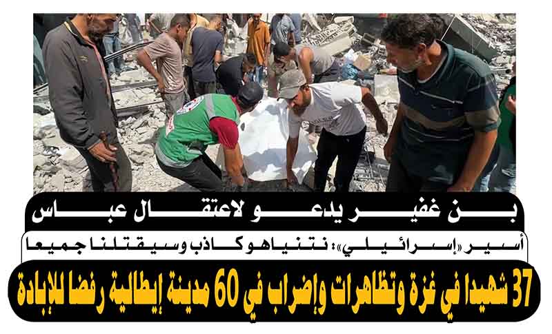 بن غفير يدعو لاعتقال عباس .. 37 شهيدا في غزة وتظاهرات وإضراب في 60 مدينة إيطالية رفضا للإبادة