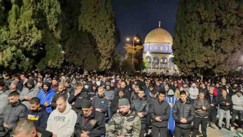 الـمــزيـدأدى عشرات آلاف المصلين الفلسطينيين ، مساء اليوم الإثنين، صلاة العشاء والتراويح في المسجد الأقصى المب. .