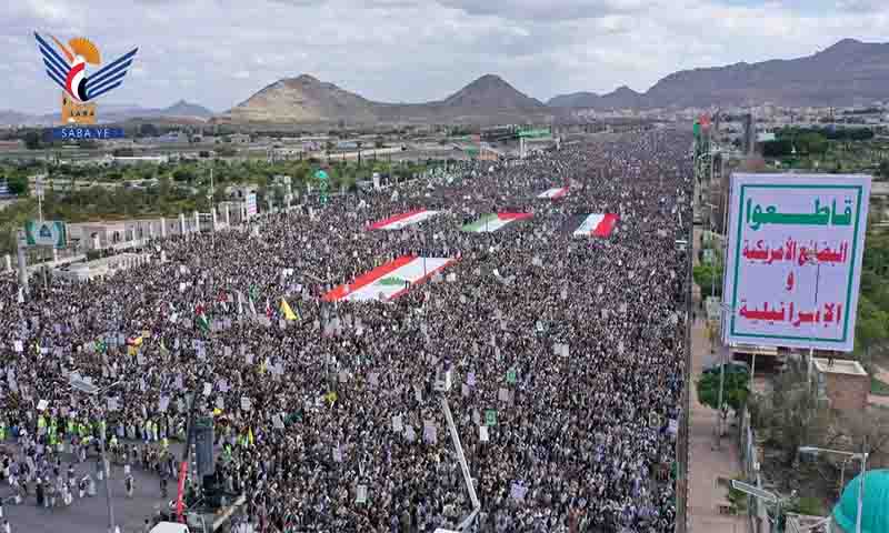 طوفان بشري بالعاصمة صنعاء في مليونية "ساحاتنا واحدة.. مع فلسطين ضد الطغيان ولن نترك لبنان"