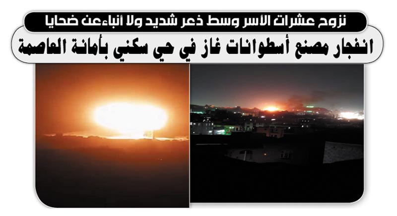 نزوح عشرات الأسر وسط ذعر شديد ولا أنباءعن ضحايا.. انفجار مصنع أسطوانات غاز في حي سكني بأمانة العاصمة