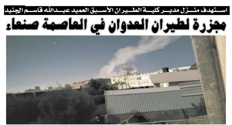 استهدف منزل مدير كلية الطيران الأسبق العميد عبدالله قاسم الجنيد.. مجزرة لطيران العدوان في العاصمة صنعاء