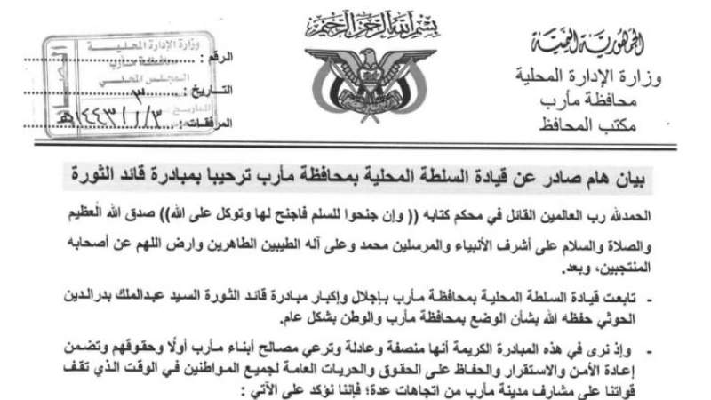الـمــزيـدرحبت السلطة المحلية في مارب، اليوم الأربعاء، بمبادرة السيد عبد الملك بدر الدين الحوثي بشأن الوضع في . .