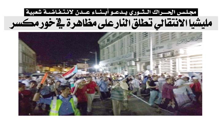 مجلس الحراك الثوري يدعو أبناء عدن لانتفاضة شعبية .. مليشيا الانتقالي تطلق النار على مظاهرة في خور مكسر