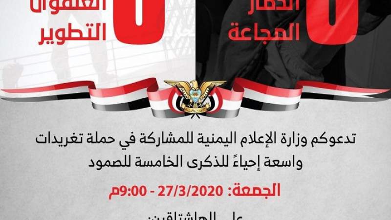 الـمــزيـدتطلق وزارة الإعلام الساعة التاسعة من مساء اليوم الجمعة، حملة تغريدات بمناسبة الذكرى الخامسة للصمود ف. .