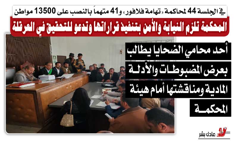 في الجلسة 44 لمحاكمة «تهامة فلافور» و41 متهماً بالنصب على 13500 مواطن.. المحكمة تلزم النيابة والأمن بتنفيذ قراراتها وتدعو للتحقيق في العرقلة