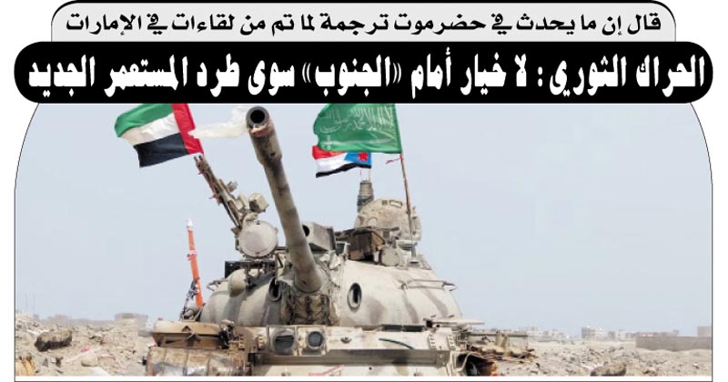 قال إن ما يحدث في حضرموت ترجمة لما تم من لقاءات في الإمارات..الحراك الثوري: لا خيار أمام «الجنوب» سوى طرد المستعمر الجديد