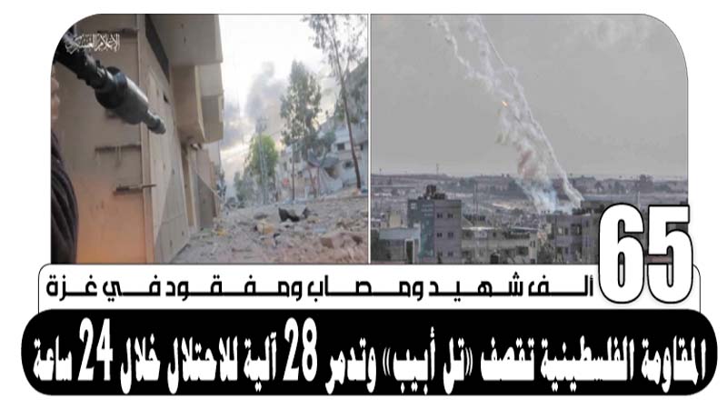 65 ألف شهيد ومصاب ومفقود في غزة.. المقاومة الفلسطينية تقصف «تل أبيب» وتدمر 28 آلية للاحتلال خلال 24 ساعة