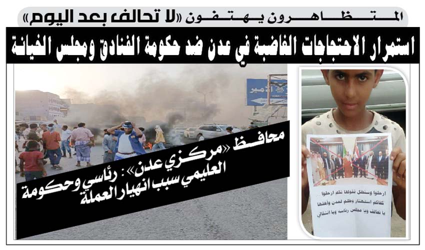 المتظاهرون يهتفون «لا تحالف بعد اليوم».. استمرار الاحتجاجات الغاضبة في عدن ضد حكومة الفنادق ومجلس الخيانة