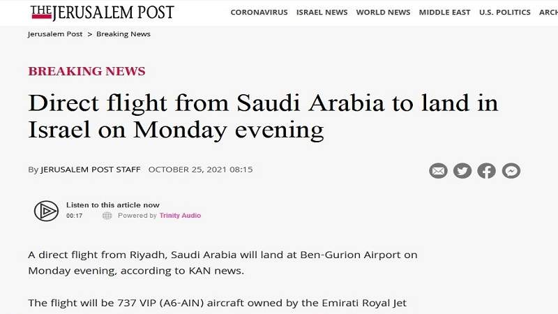 تهبط مساء اليوم الاثنين، رحلة جوية مباشرة في مطار بن غوريون بتل أبيب قادمة من الرياض، في سياق التطبي. .