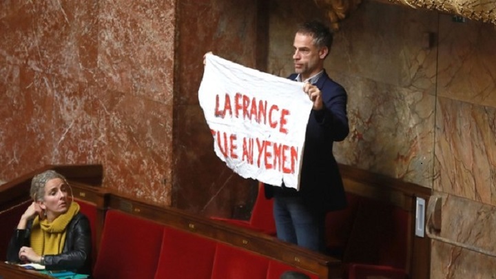 الـمــزيـدعلق نائب بالمجلس الوطني(البرلمان) الفرنسي، الثلاثاء، لافتة كتب عليها "فرنسا تقتل في اليمن"، احتجاجًا. .
