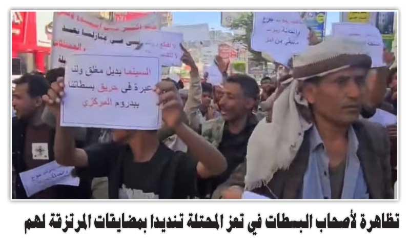 نظم العشرات من مالكي البسطات في مدينة تعز المحتلة، اليوم، وقفة احتجاجية تنديدا بمضايقة المرتزقة لهم وحملة الإزالة التي طالت مصادر دخلهم دون توفير بدائل مناسبة.